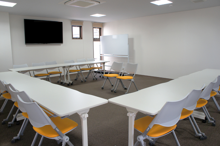 また、使用する机と椅子は折りたたむことができ、タイヤが付いているので、速やかに一か所に寄せることも可能です。